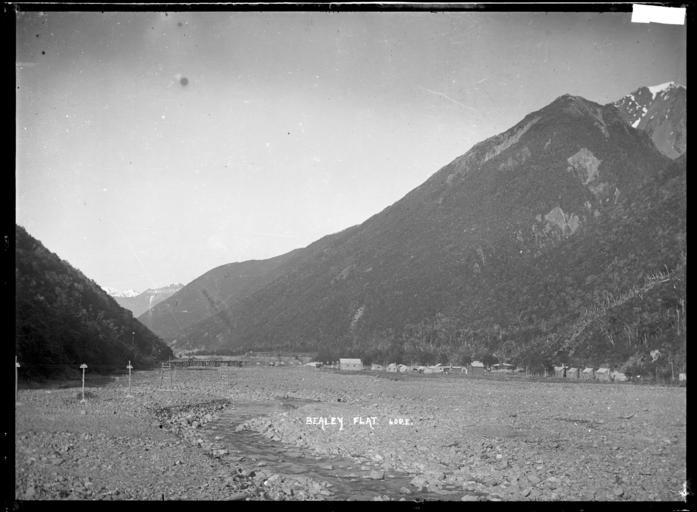 | Keywords: blackandwhite monochrome photo border outdoor hill landscape black and white View of Bealey Flat, showing a row of small houses on the on the right of the shingle river-bed, and the railway bridge centre left. Scene shows a valley with bushclad hills down to the flats, and the snow-covered Southern Alps in the distance. Photograph taken by William Archer Price Inscriptions: Inscribed - Photographer's title on negative -bottom centre: Bealey Flat. [No.] 608.E.. Quantity: 1 b&w original negative(s). Physical Description: Dry plate glass negative 4.5 x 6.5 inches View of Bealey Flat. Price, William Archer, 1866-1948 :Collection of post card negatives. Ref: 1/2-000015-G. Alexander Turnbull Library, Wellington, New Zealand. natlib.govt.nz/records/23059913 View of Bealey Flat, showing a row of small houses on the on the right of the shingle river-bed, and the railway bridge centre left. Scene shows a valley with bushclad hills down to the flats, and the snow-covered Southern Alps in the distance. Photograph taken by William Archer Price Inscriptions: Inscribed - Photographer's title on negative -bottom centre: Bealey Flat. [No.] 608.E.. Quantity: 1 b&w original negative(s). Physical Description: Dry plate glass negative 4.5 x 6.5 inches View of Bealey Flat. Price, William Archer, 1866-1948 :Collection of post card negatives. Ref: 1/2-000015-G. Alexander Turnbull Library, Wellington, New Zealand. natlib.govt.nz/records/23059913 |