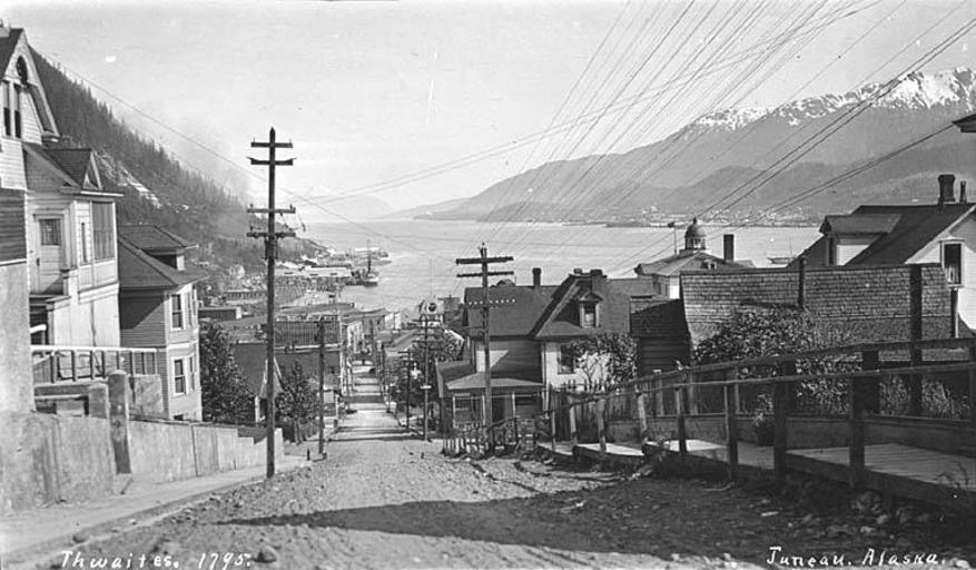 | Keywords: View down a steep street in Juneau, ca 1912 (THWAITES 237).jpeg check categories 27 October 2016 5 Photograph Creator John E Thwaites Caption on image Juneau Alaska PH Coll 247 426<br/>Located on the mainland of Southeast Alaska Juneau was built at the heart of the Inside Passage along the Gastineau Channel The area was a fish camp for the indigenous Tlingit Indians In 1880 nearly 20 years before the gold rushes to the Klondike and Nome Joe Juneau and Richard Harris were led to Gold Creek by Chief Kowee of the Auk Tribe They found mother lode deposits upstream staked their mining claims and developed a 160 acre incorporated city they called Harrisburg which brought many prospectors to the area The City of Juneau was formed in 1900 The state capital was transferred from Sitka to Juneau in 1906 while Alaska was a U S Territory The Treadwell and Ready Bullion mines across the channel on Douglas Island became world-scale mines operating from 1882 to 1917 In 1916 the Alaska-Juneau gold mine was built on the mainland and became the largest operation of its kind in the world In 1917 a cave-in and flood closed the Treadwell mine on Douglas It produced 66 million in gold in its 35 years of operation Fishing canneries transportation and trading services and a sawmill contributed to Juneau's growth through the early 1900s A federally recognized tribe is located in the community -- the Central Council Tlingit Haida Indian Tribes of Alaska; Douglas Indian Association; Aukquan Traditional Council not recognized Juneau has a Tlingit history with a strong historical influence from the early prospectors and boom town that grew around full-scale gold mining operations Subjects LCTGM Juneau Alaska ; Hills--Alaska--Juneau; Streets--Alaska--Juneau; Dirt roads--Alaska--Juneau; Cities and towns--Alaska; Utility poles--Alaska--Juneau; Dwellings--Alaska--Juneau<br Gastineau Channel Alaska depicted place Juneau Alaska ca 1912 Institution University of Washington UWASH-THWAITES-source accession number thwaites 237 PD-old-auto-1923 1940 Information field Order Number THW218 Images from the John E Thwaites Photographs of Alaska Collection to check Juneau Alaska Hills of Alaska Streets in Alaska Dirt roads Utility poles |