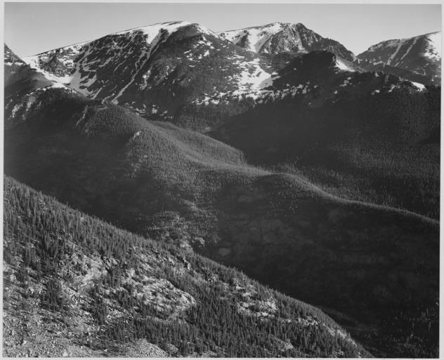 Keywords: View of hills and mountains, "In Rocky Mountain National Park," Colorado, 1933 - 1942 - NARA - 519956.jpg Local identifier 79-AA-M03 Department of the Interior National Park Service Branch of Still and Motion Pictures - NARA-Author Adams Ansel 1902-1984 Photographer 1332556 <br /> Still Picture Records Section Special Media Archives Services Division NWCS-S National Archives at College Park 8601 Adelphi Road College Park MD 20740-6001 1933 - 1942 Record group Record Group 79 Records of the National Park Service 1785 - 2006 Record group ARC 408 Ansel Adams Photographs of National Parks and Monuments compiled 1941 - 1942 documenting the period ca 1933 - 1942 Series ARC 519830 Variant control numbers NAIL Control Number NWDNS-79-AA-M03 General notes Scope and content File unit File unit ARC <gallery> File View_of_hills_and_mountains _ In_Rocky_Mountain_National_Park _Colorado _1933_-_1942_-_NARA_-_519956 tif tif File View_of_hills_and_mountains _ In_Rocky_Mountain_National_Park _Colorado _1933_-_1942_-_NARA_-_519956 jpg jpg </gallery> NARA-cooperation PD-USGov Rocky Mountain National Park as photographed by Ansel Adams |