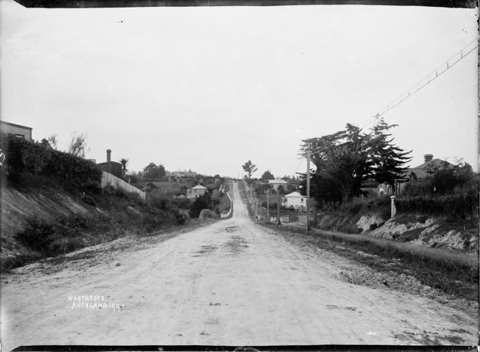 | Keywords: blackandwhite monochrome outdoor photo border road black and white View looking east along Stafford Road, Northcote, showing houses on both sides and power lines and a footpath on the righthand side. A group of boys can be seen standing opposite the white fence in the middle distance. The Maxwell house is visible on the lefthand side of the road at the horizon. Taken by William Price, pre-1920. William Archer Price lived and practised in Queen Street, Northcote, 1909-1910. Source: New Zealand Post Office directories Quantity: 1 b&w original negative(s). Physical Description: Dry plate glass negative 4.5 x 6.5 inches View looking down Stafford Road, Northcote, Auckland. Price, William Archer, 1866-1948 :Collection of post card negatives. Ref: 1/2-001708-G. Alexander Turnbull Library, Wellington, New Zealand. natlib.govt.nz/records/22417175 View looking east along Stafford Road, Northcote, showing houses on both sides and power lines and a footpath on the righthand side. A group of boys can be seen standing opposite the white fence in the middle distance. The Maxwell house is visible on the lefthand side of the road at the horizon. Taken by William Price, pre-1920. William Archer Price lived and practised in Queen Street, Northcote, 1909-1910. Source: New Zealand Post Office directories Quantity: 1 b&w original negative(s). Physical Description: Dry plate glass negative 4.5 x 6.5 inches View looking down Stafford Road, Northcote, Auckland. Price, William Archer, 1866-1948 :Collection of post card negatives. Ref: 1/2-001708-G. Alexander Turnbull Library, Wellington, New Zealand. natlib.govt.nz/records/22417175 |
