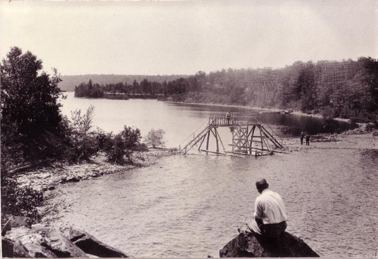 | Keywords: merrill denison merrilldenison bon echo bonecho bridge narrows mazinaw 1920 bon echo inn bonechoinn mazinaw rock mazinawrock outdoor This photo is part of the Bon Echo archives. It features a man atop Mazinaw Rock (likely Merrill Denison) looking down at the Narrows Bridge. The bridge enabled visitors of the Bon Echo Inn to reach the staircase (steel) that led to the top of Mazinaw Rock. The lagoon can be seen at the top right and a dock which has remains that can be seen today. This photo is part of the Bon Echo archives. It features a man atop Mazinaw Rock (likely Merrill Denison) looking down at the Narrows Bridge. The bridge enabled visitors of the Bon Echo Inn to reach the staircase (steel) that led to the top of Mazinaw Rock. The lagoon can be seen at the top right and a dock which has remains that can be seen today. |