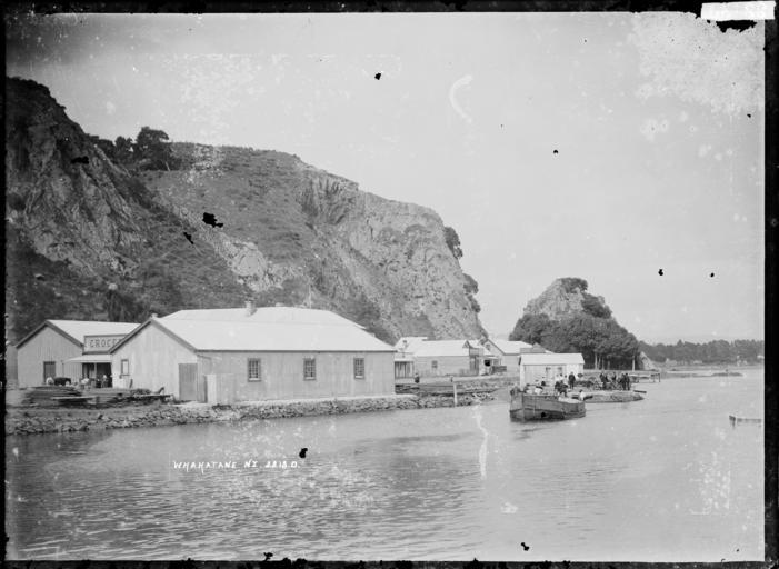 | Keywords: blackandwhite monochrome photo border outdoor black and white View of Whakatane, showing the sign for the shop of George Creeke (grocer and baker) behind a small building on the water's edge. A group of people are standing on a small promontory, with a laden barge coming towards the camera. To the left there are large warehouses. All the buildings are on a narrow stretch of land between high cliffs and the river. Photograph taken by William A Price between 1900 and 1910. Inscriptions: Inscribed - Photographer's title on negative -bottom left: Whakatane. NZ. 2213.D. Quantity: 1 b&w original negative(s). Physical Description: Dry plate glass negative View of Whakatane. Price, William Archer, 1866-1948 :Collection of post card negatives. Ref: 1/2-001767-G. Alexander Turnbull Library, Wellington, New Zealand. natlib.govt.nz/records/22464467 View of Whakatane, showing the sign for the shop of George Creeke (grocer and baker) behind a small building on the water's edge. A group of people are standing on a small promontory, with a laden barge coming towards the camera. To the left there are large warehouses. All the buildings are on a narrow stretch of land between high cliffs and the river. Photograph taken by William A Price between 1900 and 1910. Inscriptions: Inscribed - Photographer's title on negative -bottom left: Whakatane. NZ. 2213.D. Quantity: 1 b&w original negative(s). Physical Description: Dry plate glass negative View of Whakatane. Price, William Archer, 1866-1948 :Collection of post card negatives. Ref: 1/2-001767-G. Alexander Turnbull Library, Wellington, New Zealand. natlib.govt.nz/records/22464467 |