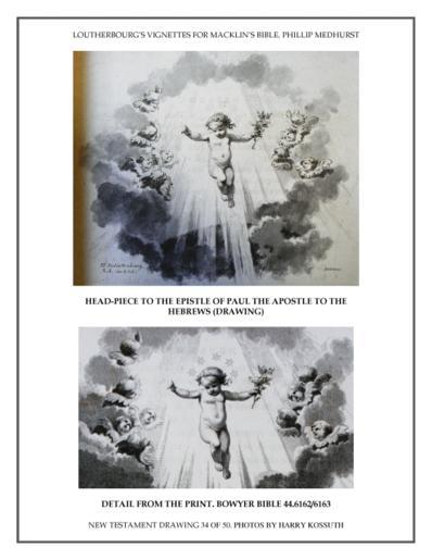 | Keywords: Vignette by Loutherbourg for the Macklin Bible 118 of 134. Bowyer Bible New Testament. Headpiece to Hebrews.gif en Head-piece to the epistle of Paul the Apostle to the Hebrews vignette with Christ-child in light from clouds with branch and halo of stars winged cherub heads surrounding; letterpress in two columns below and on verso 1800 Inscriptions Lettered below image with production detail P J de Loutherbourg Invt et del J Heath dirt and publication line Published by T Macklin July 1 1800 Print made by James Heath Dimensions height 490 millimetres; width 390 millimetres Photos by Harry Kossuth Phillip Medhurst 1800 07 01 PD-Art Epistle to the Hebrews Vignettes by Loutherbourg for the Macklin Bible Vignette Drawings by Loutherbourg in the Bowyer Bible Art depicting the New Testament by Philippe De Loutherbourg |