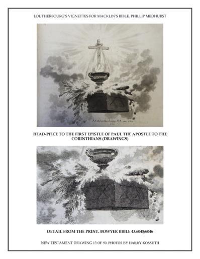 | Keywords: Vignette by Loutherbourg for the Macklin Bible 97 of 134. Bowyer Bible New Testament. Headpiece to 1 Corinthians.gif en Head-piece to the first epistle of Paul the apostle to the Corinthians vignette with water pouring from a crucifix standing over a flaming bowl on a ledge with grain in clouds; letterpress in two columns below and on verso 1800 Inscriptions Lettered below image with production detail P J de Loutherbourg invt et delt J Heath direx Print made by James Heath Dimensions height 480 millimetres; width 380 millimetres Photos by Harry Kossuth Phillip Medhurst 1800-01-01 PD-old-100 First Epistle to the Corinthians Vignettes by Loutherbourg for the Macklin Bible Vignette Drawings by Loutherbourg in the Bowyer Bible Art depicting the New Testament by Philippe De Loutherbourg James Heath |