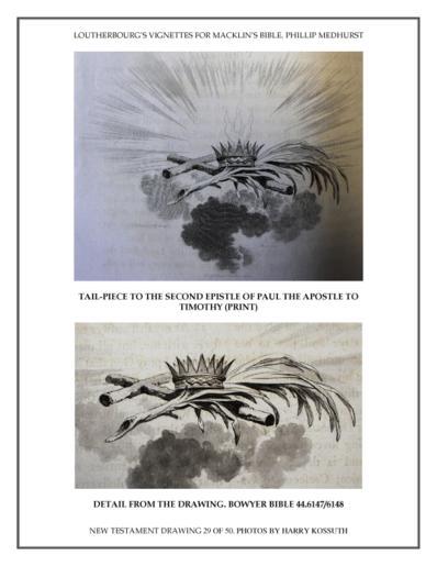 | Keywords: Vignette by Loutherbourg for the Macklin Bible 113 of 134. Bowyer Bible New Testament. Tailpiece to 2 Timothy.gif en Tail-piece to the second epistle of Paul the apostle to Timothy vignette with a crown with flame above resting on a palm branch and cross against clouds 2 Timothy 4 ; letterpress in two columns above and on verso 1800 Inscriptions Lettered below image with production detail P J de Loutherbourg RA del et invt J Heath direx and publication line Pubd by T Macklin Fleet Street London Print made by James Heath Dimensions height 490 millimetres; width 390 millimetres Photos by Harry Kossuth Phillip Medhurst 1800-01-01 PD-old-100 Second Epistle to Timothy Vignettes by Loutherbourg for the Macklin Bible Vignette Drawings by Loutherbourg in the Bowyer Bible Art depicting the New Testament by Philippe De Loutherbourg |