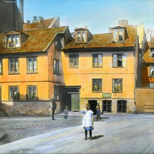 Keywords: jenter barn gater bygårder bybebyggelse foretninger kull ved oslo norge nor outdoor architecture building Håndkolorert dias. En jente kledd i kjole står på gata foran en bygård i Vika, Oslo, i 1904. I bakgrunnen står tre andre små barn og en ung gutt. På bygården henger et skilt for "Strandgadens Kul og Ved-Forretning". Håndkolorert dias. En jente kledd i kjole står på gata foran en bygård i Vika, Oslo, i 1904. I bakgrunnen står tre andre små barn og en ung gutt. På bygården henger et skilt for "Strandgadens Kul og Ved-Forretning". |
