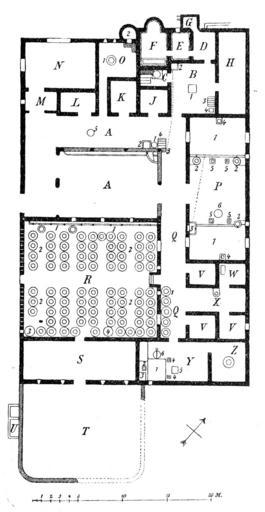 | Keywords: Villa boscoreale plan.png ru План виллы в Боско еале A - дво ат ий B - кухня C-G - баня с тепида ием кальда ием и т д H - конюшни E - кладовая K и L - спальни N - столовая M - пе едняя O - пека ня P - виног адная давильня Q - ко идо R - склад бочек с вином T - ток U - езе вуа для дождевой воды VVV - спальни X - учная мельница Z - маслобойни en Villa boscoreale plan A - court atrium B - kitchen C-G - bath with the tepidarium caldarium etc H - stables E - larder K и L - living rooms N - dining room M - anteroom O - bakery P - wine press Q - corridor R - wine storehouse T - threshing floor U - pluvial VVV - living rooms X - handmill Z - oil mills ru С О Цыбульский Римский дом СПб типог афия В А Тиханова 1902 en S Cybulski Roman house - Saint-Petersburg Tikhanavs publishing house 1902 < 1902 Not mentioned PD PD-Art Villa of Boscoreale Floor plans of ancient Roman buildings in Italy Housebarns |