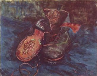 | Keywords: Vincent Willem van Gogh 117.jpg Artwork Creator Vincent van Gogh Paris early 1887 oil canvas cm 34 41 5 Institution Baltimore Museum of Art accession number 1950 302 http //www artbma org/educators/atg/pdf/atg_12-07 pdf The Baltimore Museum of Art<br/>http //www vangoghgallery com/catalog/Painting/379/Pair 20of 20Shoes 20A html vangoghgallery com object history credit line The Cone Collection formed by Dr Claribel Cone and Miss Etta Cone of Baltimore Maryland exhibition history Vincent 87 ~ lower right signature and date Van Gogh catalogues 333 1236 Yorck http //mail wikipedia org/pipermail/wikide-l/2005-April/012195 html PD-old-100 PD-Art-YorckProject DEFAULTSORT Van Gogh 1887 A pair of shoes Baltimore Museum of Art A pair of shoes by Vincent van Gogh Paris 1887 |