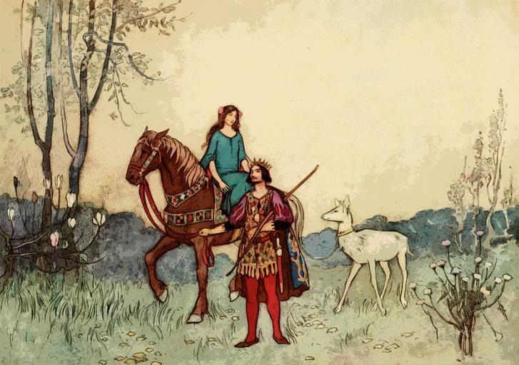 Keywords: vintage old antique charming enchanted enchanting retro illustrated warwick goble illustrator fairy tale story book illustration art fantasy nature people person woman horse man knight princess equestrian stallion horseback ride female animal rural riding caucasian
