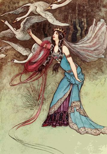 Keywords: vintage retro enchanted charming fairy tale enchanting book illustration warwick goble art illustrator fairytale old antique people woman female lady princess beauty swans birds animals wildlife