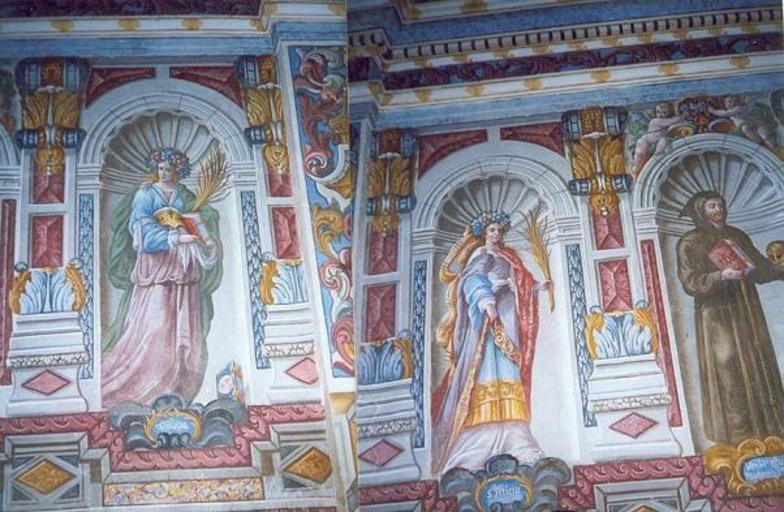 | Keywords: Virgen de Casbas (frescos). Ayerbe.jpg Artwork es Virgen de Casbas es frescos En la ermita de Nuestra Señora de Casbas la decoración pictórica de autor desconocido es toda de una mano y ofrece un programa iconográfico completo Se extiende por muros lunetos y arcos e incluye abundantes motivos de ornamentación barroca realizados con buen dibujo que denota precisión y soltura El colorido es el característico del momento primera mitad del Siglo XVIII a base de colores primarios sin gran variedad de tonos intermedios que amortigüen los contrastes Enmarcadas en hornacinas aveneradas pintadas aparecen reproducidas las siguientes imágenes que en el muro del evangelio comenzando desde la capilla mayor son San Lucas San Mateo San Pedro San Pablo San José Santa Elena San Valero San Felipe Neri San Antonio Abad y el niño San Quilez o Quirico En el muro opuesto San Juan San Marcos San Joaquín Cristo Crucificado Santa Ana Santa Leticia San Francisco y Santa Lucia Bibliografía Naval Mas Antonio y Joaquín Inventario Histórico-Artístico de Huesca y su provincia Tomo I Ministerio de Cultura Madrid 1980 credit line Autor fotográfico Chesús Á Giménez Arbués es Ayerbe own Creator PD-Art Other versions GFDL relicense Ermita de Nuestra Señora de Casbas Ayerbe Frescos in Spain Philip Neri Church paintings in Aragón |