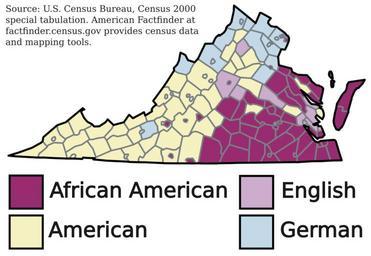Keywords: Virginia Ancestries by County.svg A chart of the top reported ancestries in Virginia as provided by the 2000 census Shaded color represents the largest number of respondents a plurality from sample Areas with the largest American ancestry populations were mostly settled by English French Welsh Scottish and Irish Census-2000-Data-Top-US-Ancestries-by-County svg 2009-04-27 18 54 UTC User Gpvos derivative work Patrick «» JPG Version in English JPG version in Spanish SVG version without text Cropped to Virginia Patrickneil Census-2000-Data-Top-US-Ancestries-by-County svg PD-USGov original upload log This image is a derivative work of the following images File Census-2000-Data-Top-US-Ancestries-by-County svg licensed with PD-USGov 2007-10-10T11 48 09Z Conscious 666x490 3169790 Bytes <nowiki>cropped</nowiki> 2007-03-09T15 44 05Z Gpvos 727x539 2953361 Bytes <nowiki>oops fixed some reintroduced errors </nowiki> 2007-03-09T15 32 46Z Gpvos 727x539 2956252 Bytes <nowiki>minor correction of text layout</nowiki> 2007-03-09T14 52 12Z Gpvos 727x539 2953193 Bytes <nowiki>now with text instead of font outlines</nowiki> 2007-03-09T14 25 16Z Gpvos 727x539 3321809 Bytes <nowiki>A chart of the top reported ancestries in the US as provided by the 2000 census Shaded color represents the largest number of respondents a plurality from sample Areas with the largest American ancestry populations wer</nowiki> Uploaded with derivativeFX Maps of Virginia Maps showing African American history |