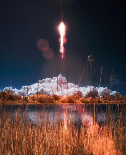 Keywords: virginia rocket travel blastoff liftoff lake water reflections infrared sky clouds flares space exploration