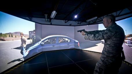 MAKE A MEME View Large Image Air Force Airman First Class Joseph Bickel from the New Jersey Air National Guard's 108th Wing esponds to a simulated threat in a VirTra firearms training simulator at a U.S. Marshal training site in Lawrenceville, N.J. on Dec. 12. Security ...