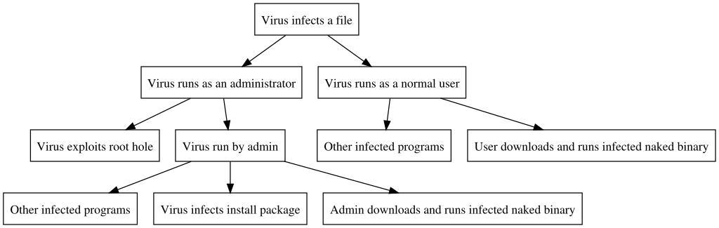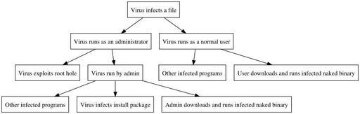 | Keywords: Virus attack tree.svg en Attack tree for computer viruses in typical systems 2013-04-24 23 55 51 own Adius Based on following dot graph digraph virus_attack_tree //graph splines ortho node shape box a label Virus infects a file b label Virus runs as an administrator c label Virus runs as a normal user d label Virus exploits root hole e label Virus run by admin f label Other infected programs g label User downloads and runs infected naked binary h label Other infected programs i label Virus infects install package j label Admin downloads and runs infected naked binary a -> b c b -> d e c -> f g e -> h i j cc-zero Uploaded with UploadWizard Uncategorized 2013 April 24 |