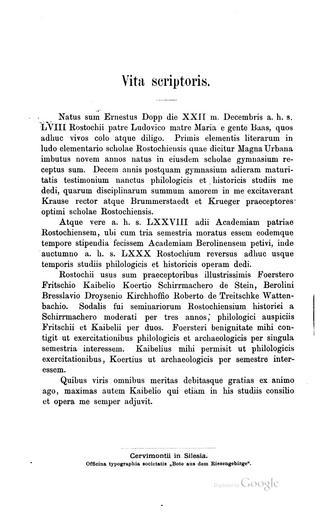 Keywords: Vita Ernst Dopp.png Lebenslauf des klassischen Philologen Ernst Dopp in seiner Rostocker Doktordissertation Quaestiones de marmore Pario Breslau 1883 S 64 http //books google de/books id 4tgfAAAAMAAJ pg PA64 Google Book Search only available from the US or via proxy Ernst Dopp 1858-1929 1883 Doctoral theses Dopp Ernst PD-old |