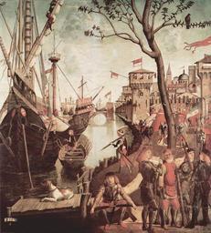 Keywords: Vittore Carpaccio 041.jpg Artwork de Gemäldezyklus zur Legende der Hl Ursula Szene Ankunft in Köln Oil Canvas cm 280 255 de Venedig de Gallerie dell'Accademia de Gemäldekomplex bestehend aus 9 Werken Auftraggeber Scuola di Sant' Orsola in Venedig The Yorck Project 10 000 Meisterwerke der Malerei DVD-ROM 2002 ISBN 3936122202 Distributed by DIRECTMEDIA Publishing GmbH 1490 Creator Vittore Carpaccio http //mail wikipedia org/pipermail/wikide-l/2005-April/012195 html Other versions PD-old-100 PD-Art-YorckProject Arrival of the Pilgrims in Cologne by Carpaccio