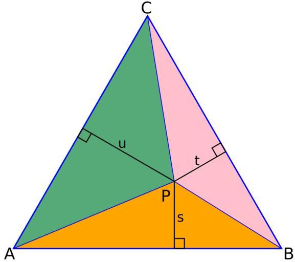 | Keywords: Viviani Theorem.svg Viviani's theorem <math>\bigtriangleup</math>ABC is an equilateral triangle and P is any random point within the triangle at distances of <math>s \ t \ u</math> from the three sides AB BC and CA respectively 2014-06-06 13 02 22 own Krishnavedala v U Krishnavedala cc-zero Uploaded with UploadWizard Viviani's theorem Equilateral triangles Geometry diagrams |