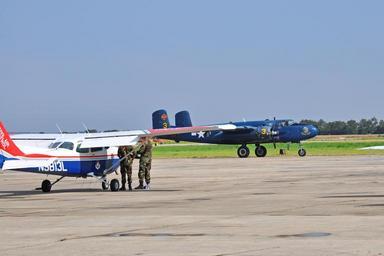 | Keywords: civil air patrol civilairpatrol cap outdoor airplane aircraft vehicle A B-25 bomber passes in front of a Civil Air Patrol Cessna 172 before the start of the VJ Day Celebration at San Marcos Municipal Airport. Photo by SM Shan Murphy A B-25 bomber passes in front of a Civil Air Patrol Cessna 172 before the start of the VJ Day Celebration at San Marcos Municipal Airport. Photo by SM Shan Murphy | ||||