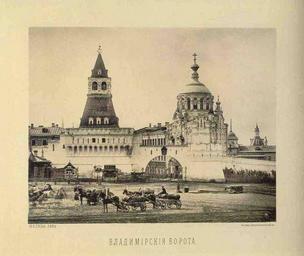Keywords: Vladimirskie Gate 1884 Moscow.jpg Vladimirskie Gate in Moscow Russia in 1884 A photo from N A Naidyonov's album printed in the 19th century Владими ские во ота в оскве в 1884 году Фотог афия из альбома А айдёнова изданного в XIX веке Moskovskaya starina A photoalbum Moscow Planeta 1995 P 76-77 ISBN 5-85250-139-5 осковская ста ина Фотоальбом Планета 1995 С 76-77 ISBN 5-85250-139-5 <br>Originally published in 1884 in осква Виды некото ых го одских местностей х амов п имечательных зданий и д угих соо ужений by Nikolay Naidenov plate 40 Photographed and published in 1884 Nikolay Naidenov 1834-1905 <br>Scanned and processed by Leonid Dzhepko thumb left thumb left PD-old-100 Vladimirsky Gate Views of Moscow by Nikolay Naidenov 1884 40d Photographs by Nikolay Naidenov