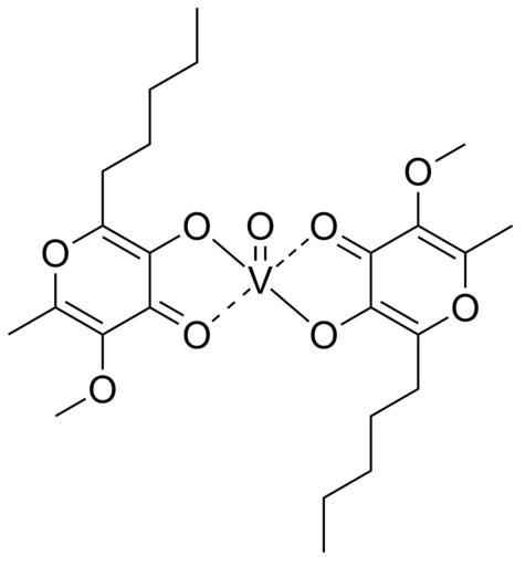Keywords: VO(alx)2.svg Chemical structure of bis allixinato oxovanadium IV a vanadium complex with allixin Own 17 39 16 February 2011 UTC Ed Edgar181 Vanadium complexes Pyrones