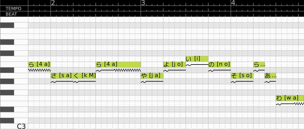Keywords: Vocal synthesizer piano roll - Sakura Sakura.svg piano roll display used on a musical sequencer supporting a synthesizer which can synthesis of singing voice The image is a representation of melody and lyrics of a Japanese song Sakura sakura using piano roll representation; in this way a song is represented by associating a note of melody and a syllable of lyrics Ž2014 Ž-12 Ž-07 Ž Ž 06 25 14 UTC song Sakura sakura image own hand drawn song Sakura sakura unknown composer and lyricist public domain by copyright expiration ; image Clusternote <span class signature-talk ></span> Custom license marker 2014 12 07 song Sakura sakura PD-old image other versions <gallery heights 90> File Sakura PNG Sakura PNG File Sakura MID Sakura MID File Sakura song png Sakura song png File Vocal synthesizer piano roll png Vocal synthesizer piano roll png File Vocal synthesizer piano roll - Sakura Sakura svg Vocal synthesizer piano roll - Sakura Sakura svg File Vocal synthesizer piano roll - Sakura Sakura jpg Vocal synthesizer piano roll - Sakura Sakura jpg File Sakura Sakura song ogg Sakura Sakura song ogg </gallery> Uploaded with UploadWizard Sakura Sakura Piano rolls Vocaloid schematics |