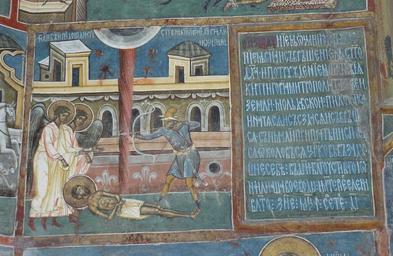 | Keywords: Voronet murals 2010 19.jpg Voroneţ Monastery Romania The church is one of the Painted churches of northern Moldavia listed in UNESCO's list of World Heritage sites own photo 14 d'Août 2010 Man vyi Own work all rights released Public domain Murals in Voroneț Murals and icons on the exterior of churches Cyrillic inscriptions in Romania |