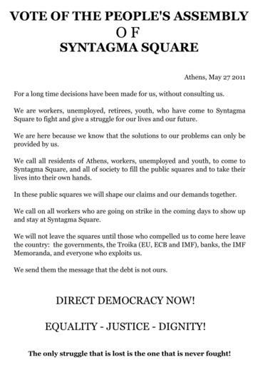 | Keywords: Vote of the People's Assembly of Syntagma Square.svg en The first vote of the People's Assembly of Syntagma Square at the ongoing protests all over Greece The vote summarizes the demands of the demonstrations across the country own based on the official text http //real-democracy gr/el/ CF 88 CE AE CF 86 CE B9 CF 83 CE BC CE B1- CE BB CE B1 CF 8A CE BA CE AE CF 82- CF 83 CF 85 CE BD CE AD CE BB CE B5 CF 85 CF 83 CE B7 CF 82- CF 80 CE BB CE B1 CF 84 CE B5 CE AF CE B1 CF 82- CF 83 CF 85 CE BD CF 84 CE AC CE B3 CE BC CE B1 CF 84 CE BF CF 82-0 here Philly boy92 2011-05 PD-ineligible Cc-zero Indignados Athens |