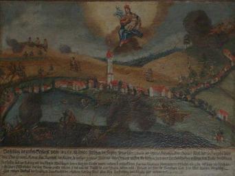 Keywords: Votivbild Schlacht bei Meßkirch.JPG Meßkirch-Rohrdorf<br /> Votivimage about the Battle of Messkirch <br/> Meßkirch-Rohrdorf<br /> Votivbild der Schlacht bei Meßkirch <br/> Text Vorstellung der großen Schlacht welche den 5 te May 1800 zwischen der kayserl Armee unter Comando des General Feldzeugmaisters Baron v Kray und die Franzosen unter dem Ober General Moreau zum Nachtheil der Kayserl In hiesiger gegend Während dieser Schlacht mussten die hießigen Inwohner ihre Habschaften meistens dem Raube der Soldaten überlassen und ihre Rettung mit dem Vieh in Waldungen suchen Auch ihre Häuser waren in einem so erschröcklichen Feur und Kugelregen Durch mehrerer Stunden ausgesetz dass solche nur durch unmittelbare Hülfe Gottes vor dem Brande gerettet würden so man mit David im 126 t Psalm bekenen muß Bewacht der Herr die Wohnungen nicht so ist aller Wachen vergeblich Zum ewigen Denkmal der schuldigen Dankbarkeit der erhaltenen Rettung seind allen disen Vorstellung und Kugeln hier aubewehrt own photographed self at the church painter unknown <br/> photographer Manuel Heinemann early 19th century pd-old thumb Battle of Messkirch