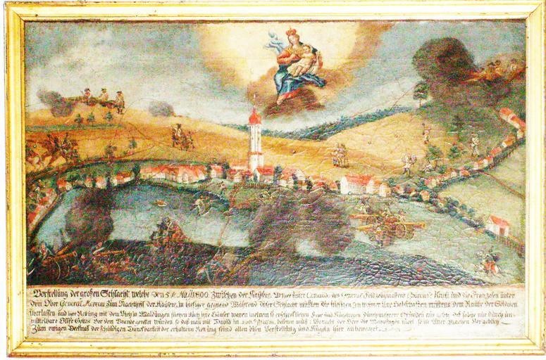 Keywords: Votivbild Schlacht bei Meßkirch mit Rahmen.jpg Meßkirch-Rohrdorf<br /> Votivimage about the Battle of Messkirch <br/> Meßkirch-Rohrdorf<br /> Votivbild der Schlacht bei Meßkirch <br/> Text Vorstellung der großen Schlacht welche den 5 te May 1800 zwischen der kayserl Armee unter Comando des General Feldzeugmaisters Baron v Kray und die Franzosen unter dem Ober General Moreau zum Nachtheil der Kayserl In hiesiger gegend Während dieser Schlacht mussten die hießigen Inwohner ihre Habschaften meistens dem Raube der Soldaten überlassen und ihre Rettung mit dem Vieh in Waldungen suchen Auch ihre Häuser waren in einem so erschröcklichen Feur und Kugelregen Durch mehrerer Stunden ausgesetz dass solche nur durch unmittelbare Hülfe Gottes vor dem Brande gerettet würden so man mit David im 126 t Psalm bekenen muß Bewacht der Herr die Wohnungen nicht so ist aller Wachen vergeblich Zum ewigen Denkmal der schuldigen Dankbarkeit der erhaltenen Rettung seind allen disen Vorstellung und Kugeln hier aubewehrt w de Datei Votivbild Schlacht bei Meßkirch JPG painter unknown <br/> photographer Manuel Heinemann early 19th century pd-old PD-US/PD-US-1923-abroad thumb Battle of Messkirch |