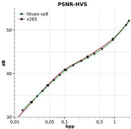 | Keywords: VP9 vs. HEVC PSNR-HVS.svg  en plot of PSNR-HVS score over bits per pixel shows that libvpx version 1 4 with VP9 format and x265 version 1 6 HEVC/H 265 format reach similar quality for equal bitrate according to the objective quality metric PSNR-HVS Kurve von PSNR-HVS-Wertungen gegenüber Bits pro Pixel zeigt dass libvpx Version 1 4 mit dem Format VP9 und x265 Version 1 6 Format HEVC/H 265 der objektiven Qualitätsmetrik PSNR-HVS zufolge bei gleicher Bitrate ähnliche Bildqualität erreichen 2015-06 https //arewecompressedyet com/ r x265_1 6_ntt-short-1 r libvpx-vp9-1 4 0-ntt-short-1 s ntt-short-1 Flugaal other versions cc-zero VP9 SVG line charts |