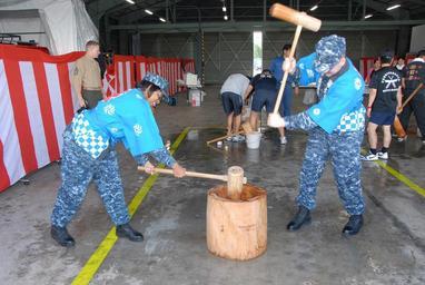 | Keywords: VP-16 in Okinawa 111221-N-RE636-051.jpg  en Sailors from Patrol Squadron VP 16 pound steamed rice during a traditional Japanese Mochi ceremony hosted by the Japan Maritime Self-Defense Force at Commander White Beach Port Facility in Okinawa VP-16 is currently forward-deployed to Kadena Air Base in Okinawa Japan Photo by Mass Communication Specialist 2nd Giuliana Mandigo 2011-12-21 Gulianna Mandigo https //www dvidshub net/image/506029 111221-N-RE636-051 2012-01-04 02 02 OKINAWA JP PD-USGov-Military-Navy Kadena Air Base Images from DoD uploaded by Fæ |