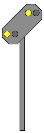 Keywords: Vr0 Licht.svg Deutsches Licht-Vorsignal Vr0 Zughalt erwarten Selbstgezeichnet nach der Beschreibung der Eisenbahn-Signalordnung Die Lichtvorsignale zeigen zwei nach rechts steigende Lichter Zwei gelbe Lichter nach rechts steigend given in the Eisenbahn-Signalordnung 2006-02-04 own assumed Qualle Diagrams of railway signals in Germany |
