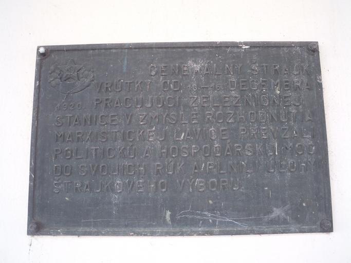 Keywords: Vrutky memorial plaque 1920 strike.JPG Vrútky Slovakia commemorating a Communist-led strike of 1920 2014-08-24 11 31 38 own Jan Pešula cc-zero Uploaded with UploadWizard Monuments and memorials in Vrútky