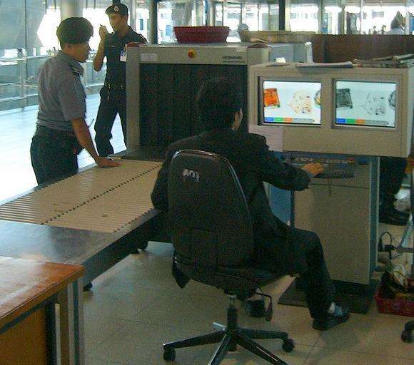 Keywords: VTBS-luggage screening-2.jpg Luggage screening device at Suvarnabhumi International Airport Bangkok Thailand This security post is located for entering the airport which means all people visitors and passengers have to pass such a control Another control will be for boarding luggage before entering the secured area passengers only View towards the street Appareil de contrôle des bagages à l'aéroport international de Suvarnabhumi à Bangkok en Thaïlande Ce poste de sécurité est situé à l'entrée de l'aéroport ce qui signifie que tout le monde visiteurs et passagers sont soumis à vérification Un autre point de contrôle est situé à l'entrée de la zone d'embarquement pour les passagers seulement La photo est prise en direction de la rue Röntgenprüfgerät mit Kontrollmonitoren am Suvarnabhumi International Airport nahe Bangkok Thailand Dies ist eine von mehreren Sicherheitskontrollen für sämtliche Personen die das Areal zu Fuß betreten Eine weitere Gepäckkontrolle findet vor dem Passagierbereich statt Die Aufnahme erfolgte in Blickrichtung zur Zubringerstraße VTBS-luggage_screening JPG 2009-03-16 12 52 UTC User Mattes derivative work Cherubino <span class signature-talk >talk</span> Detail VTBS-luggage_screening JPG Air travel Security</nowiki> Uploaded with derivativeFX Category Interior of Suvarnabhumi International Airport Men at work People with berets Security X-rays Smiths Heimann