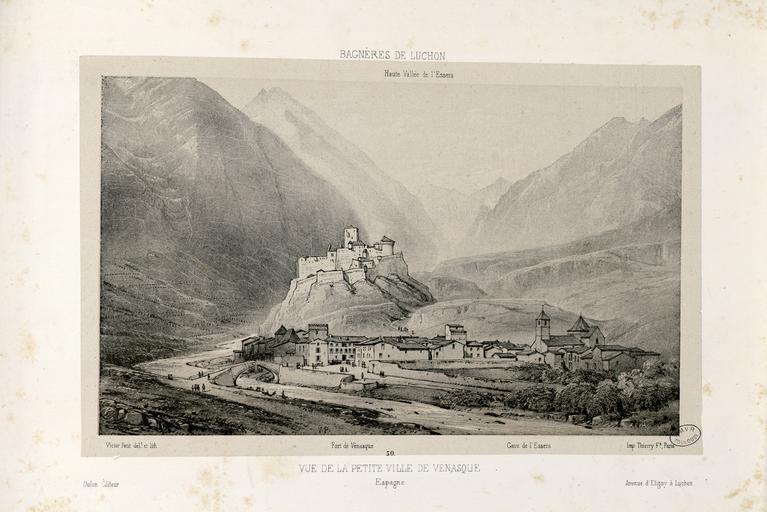 | Keywords: Vue de la petite ville de Vénasque - Espagne - Fonds Ancely - B315556101 A PETIT 1 028.jpg Fait partie d'un recueil de 30 lithographies chiffrées de 1 à 30 La lithographie n°16 est sur double page il n'y a pas de lithographie chiffrée 17 Les planches du premier tirage de cette suite imprimées chez Thierry à Paris ont été publiées en 1854 et 1855 L'éditeur de Victor Petit n'est plus celui des précédents recueils Bassy à Pau mais Dulon libraire-éditeur à Bagnères-de-Luchon et à Saintes Dulon publiera ultérieurement à plusieurs reprises des recueils de vues de Luchon et autres sites des Pyrénées par Victor Petit dont la composition est très variable Les planches ne seront plus tirées chez Thierry mais par l'imprimerie J Monrocq à Paris Pièce jointe entre la pl 6 et la pl 7 une pl extraite de Les Pyrénées a été ajoutée Sa légende est la suivante Cirque de Gavarnie - Vue prise du Chemin de la Coumélie Cette planche a été éditée par Dulon mais a été imprimée chez J Monrocq à Paris Ancely René 1876 - 1966 Possesseur fre public domain domaine public B315556101_A_PETIT_1_028 jpg image/jpeg 1 f de pl lithogr ; 26 5 cm oblong Dulon Éditeur Thierry 17 -18 ; imprimeur-lithographe Imprimeur http //numerique bibliotheque toulouse fr/collect/general/index/assoc//ark /74899/B315556101_A_PETIT_1_028 dir/B315556101_A_PETIT_1_028 jpg Bibliothèque municipale de Toulouse A-PETIT 1-27 Creator Victor Jean-Baptiste Petit http //catalogues toulouse fr/web2/tramp2 exe/do_keyword_search/log_in setting_key BMT1 servers 1home query p001940 vignette http //numerique bibliotheque toulouse fr/collect/general/index/assoc//ark /74899/B315556101_A_PETIT_1_028 dir/B315556101_A_PETIT_1_028_thumb jpeg century 19 Vue de la petite ville de Vénasque - Espagne B315556101_A_PETIT_1_028 lithography - print Women in art Castles in art Ramparts Victor Jean-Baptiste Petit Castles in the province of Huesca History of Pyrénées Benasque Bridges in art Towers in art Churches in art Mounds Bell towers in art Mountains in art Roads in art Men in art Houses in art Rivers in art Esera River |