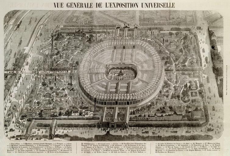 | Keywords: Vue générale de l'exposition universelle.jpg Bird's eye view of the 1867 Paris World Fair The circular building in the center of the image is the palais du Champ-de-Mars which contained a large part of the Fair The Palais was built by Frédéric Le Play and Jean-Baptiste Krantz and housed the countries' exhibits France occupied about 40 percent of its total surface The map shows all of the other pavilions and foreign sections of the Fair most of which were located around the palais 1867 engraving 25 2 x 42 3 cm Institution Brown University Library object history exhibition history credit line accession number 1254184437525081 PD-old Engravings of Paris Images of Paris from the Brown University Library Exposition Universelle 1867 Champ-de-Mars Palais du Champ-de-Mars 1867 Bird's-eye views of Paris |