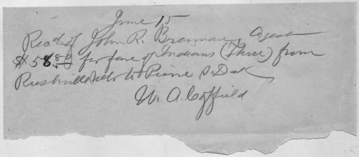 Keywords: W.A. Coffield to John R. Brennan - NARA - 285003.tif Scope and content This is document pertains to Murder of Pugh Brave Heart April 12 1907 to July 3 1907 General notes Receipt for train fare of three Indians from Rushville Nebraska to Pierre South Dakota 285003 Local identifier Department of the Interior Office of Indian Affairs Pine Ridge Agency 1878 - 09/17/1947 NARA's Central Plains Region Kansas City NREA 400 West Pershing Road Kansas City MO 64108 1907-06-15 Record group Record Group 75 Records of the Bureau of Indian Affairs 1793 - 1999 Record group ARC 404 Records of Controversies compiled 04/01/1867 - 1879 Series ARC 284971 File unit Murder of Pugh Brave Heart 04/12/1907 - 07/03/1907 File unit ARC 284989 Variant control numbers NAIL Control Number NRE-75-67-BB-14 yes Other versions NARA-cooperation PD-USGov Documents in English |