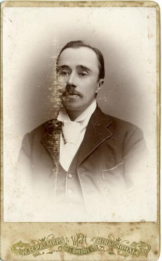 | Keywords: W H Palmer Birmingham 001.jpg 1860-1900 carte de visite photo of a young man with moustache by W H Palmer of Birmingham England ;Points of interest His tie is so starched that it looks like paper His wing collar may well be paper The photograph is so well-focused that it shows the fine wrinkles below his eyes The rest of the skin on his face appears to be even more finely wrinkled although that may be just texturing of the picture His suit or blazer has contrast binding around the edges The reverse of this card is blank Scan of photo in uploader's possession 1860-1900 W H Palmer out of copyright PD-art Cartes de visite 19th-century portrait photographs W H Palmer of Birmingham |