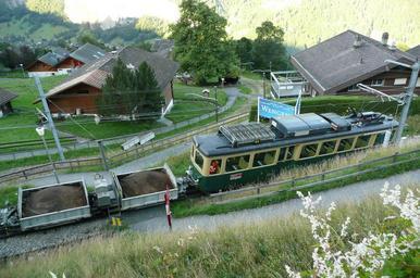 Keywords: WAB Guetertriebwagen 104 Strecke.jpg en Wengernalp rack railway Motor coach BDhe 4/4 104 of 1951 used as cargo mover with new traction arrangement 2005 from Vossloh-Kiepe GmbH Duesseldorf With double dump wagon Fk-u 807 below Wengen line Lauterbrunnen-Kleine Scheidegg “ 2009-08-05 de Wengernalpbahn Zahnradbahn Als Guetertriebwagen genutzter BDhe 4/4 104 von 1951 seit 2005 mit neuer Antriebsausruestung Vossloh-Kiepe GmbH Duesseldorf Mit Doppelkippwagen Fk-u 807 unterhalb Wengen Linie Lauterbunnnen-Kleine Scheidegg “ 05 08 2009 own Rahimsa Images 2009-08-05 WAB BDhe 4/4 Bt Vossloh Kiepe |