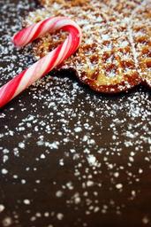 Keywords: waffle candy cane christmas sugar sweetness food icing sugar sweet baked wood background herzchen heart waffle breakfast waffles christmas card