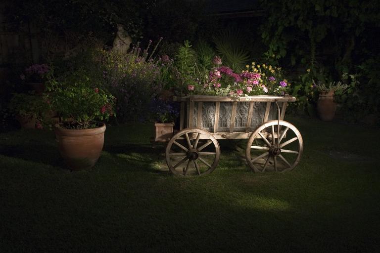 Keywords: wagon rustic garden nighttime outdoors torchlit flora cart pots