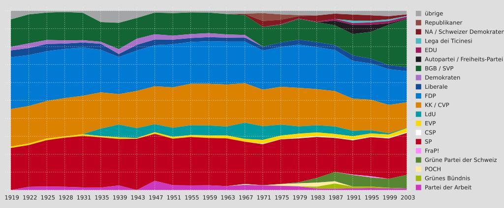 Keywords: Wähleranteil Nationalrat Schweiz.svg Wähleranteil der Parteien im Schweizer Nationalrat 1919-2003 Own 2 4 2007 David Herzog User Numerus Klausus Elections in Switzerland Swiss National Council Demographics of Switzerland