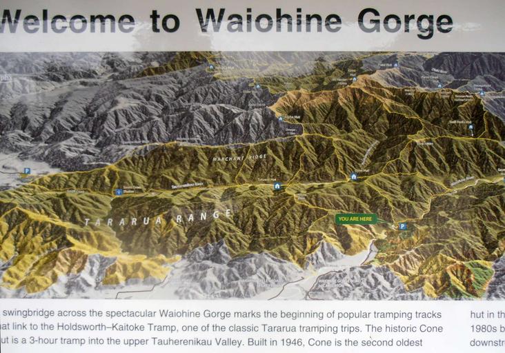 MAKE A MEME View Large Image Waiohine Gorge sign.jpg Sign at Waiohine Gorge carpark <br>Shows also locations of C Alpha Hut Cone Hut Elder Hut Field Hut Kime Hut Maungahuka Hut Neill Forks Hut Penn Creek Hut Renata Hut Sayers Hut Smith Creek Shelter X Tutuwai Hut own ...