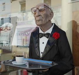 Keywords: waiter upper eat drink coffee advertising restaurant pub control plastic tray black white fly