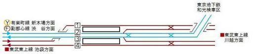 Keywords: Wakoshi.Sta.track.jpg ja 和光市駅 配線略図 own 投稿 撮影 E231-Tobucchi 2009-09-15 Wakōshi Station Rail track diagrams of Tobu Railway train stations