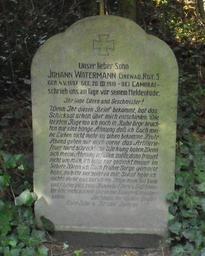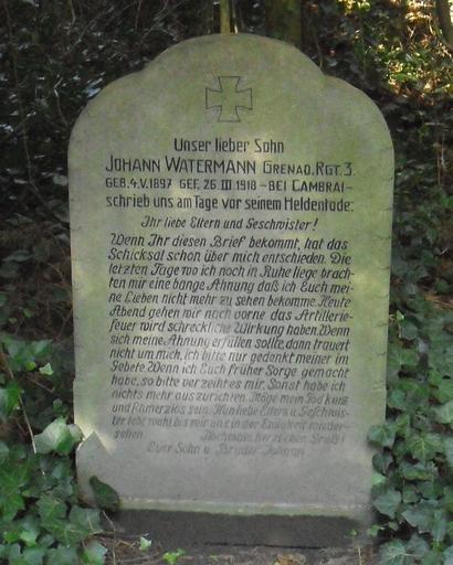 Keywords: Waldfriedhof Schloss Neuhaus-Gedenkstein Johann Watermann.jpg de Waldfriedhof Schloß Neuhaus Gedenkstein Johann Watermann mit Abschiedsbrief own Athde 2011-10-16 Cc-zero Inschrift <poem> Unser lieber Sohn JOHANN WATERMANN GRENAD RGT 3 GEB 4 V 1897 GEF 26 III 1918 “ BEI CAMBRAI “ schrieb uns am Tage vor seinem Heldentode <i>Ihr liebe Eltern und Geschwister Wenn Ihr diesen Brief bekommt hat das Schicksal schon über mich entschieden Die letzten Tage wo ich noch in Ruhe liege brachten mir eine bange Ahnung dass ich Euch meine Lieben nicht mehr zu sehen bekomme Heute Abend gehen wir nach vorne das Artilleriefeuer wird schreckliche Wirkung haben Wenn sich meine Ahnung erfüllen sollte dann trauert nicht um mich ich bitte nur gedenkt meiner im Gebete Wenn ich Euch früher Sorgen gemacht habe so bitte verzeiht es mir Sonst habe ich nichts mehr auszurichten Möge mein Tod kurz und schmerzlos sein Nun liebe Eltern und Geschwister lebt wohl bis wir uns in der Ewigkeit wiedersehen Nochmals herzlichen Gruß Euer Sohn und Bruder Johann</i> </poem> Waldfriedhof Schloß Neuhaus Letters of Germany German inscriptions in Paderborn |