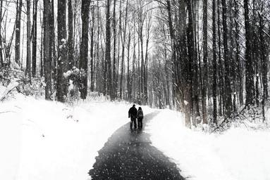 Keywords: walking couple people walking snow snowfall nature frost cold female girl trees woods forest outside person outdoors husband and wife walk path branches