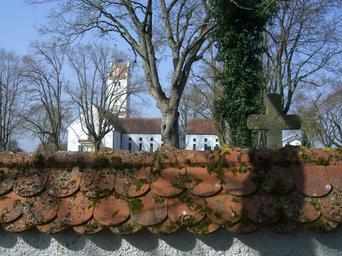 Keywords: wall cemetery wall cemetery church cross stone cross roofing tile moss weave church st peter's church langenau tower steeple storchennest stork spire breed nest storks sky blue sky blue trees aesthetic rest
