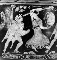 Keywords: Walters-Dresden Painter - Bell-Krater with Satyrs and Maenads and Three Draped Men - Walters 4875 - Side A Detail.jpg This red-figure bell-krater depicts satyrs and maenads revelling on the front On the left a satyr wearing a fawn skin for a cloak and a wreath stands to the right; in his right hand he holds up a thyrsos from which an ivy vine hangs In front of him a maenad dances right looking around She wears a peplos girded at the waist bracelets earring wreath and possibly a necklace Over her head she holds a thyrsos in her right hand and in her left is a tympanum Next comes a satyr who goes right looking around He also wears a fawn skin for a cloak and a wreath His right arm is extended back over his head and in his left hand he holds a thyrsos On the right another maenad dances right looking around She wears a peplos diadem earring necklace bracelets and wreath and holds a ribbon between her hands Rocks and foliage fill out the scene On the back are three mantled youths two to the right and the third to the left The first holds a circular object possibly a aryballos in his extended right hand The one in the center gestures withhis right hand The third holds an aryballos by a string in his extended right hand A strigil hangs by his head The last two wear fillets Revelling satyrs and maenads is a popular subject at this time and similarly posed dancing figures are common ca 390 380 BC late Classical terracotta with handles cm 33 6 34 7 h x diam ; at mouth cm 34 2 diam ; at foot cm 17 1 diam accession number 48 75 30808 Don Marcello Massarenti Collection Rome cat no 195 Henry Walters city Baltimore Walters Art Museum Henry Walters Acquired by Henry Walters with the Massarenti Collection 1902 place of origin Attica Greece Walters Art Museum license Ancient Greek red-figure pottery in the Walters Art Museum Media contributed by the Walters Art Museum needs category review Walters-Dresden Painter Media contributed by the Walters Art Museum needs artist update Satyrs in ancient Greek pottery Dancing maenads in ancient Greek pottery |